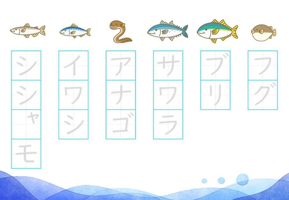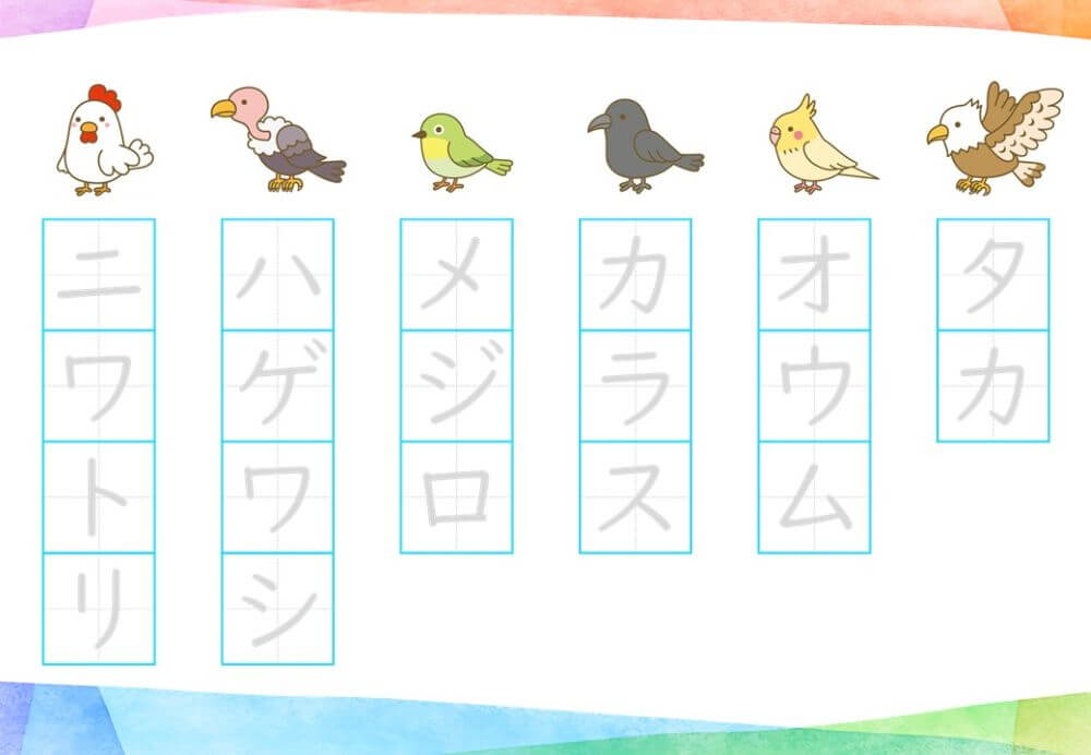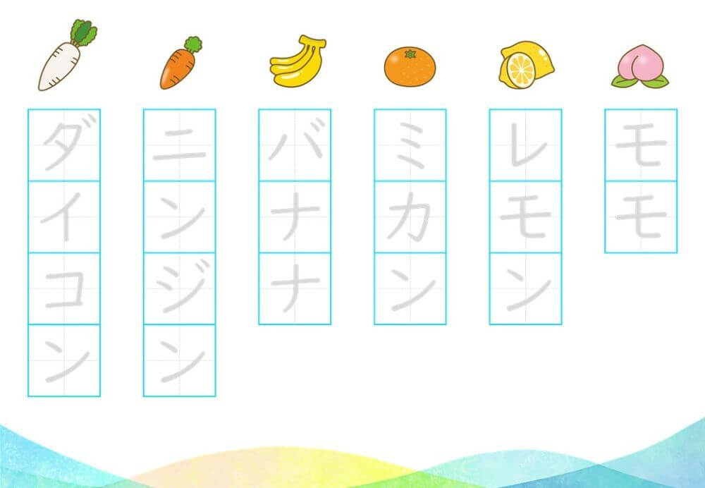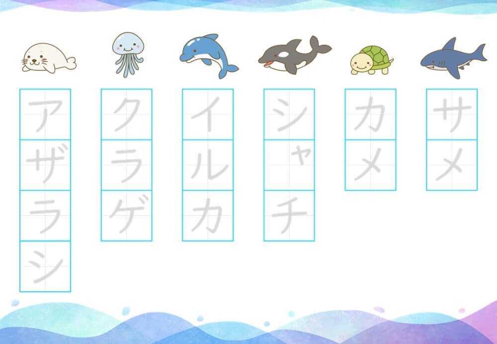 イラストと見本の文字を見ながら、横に同じカタカナを書き写すプリントです。