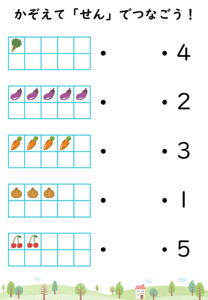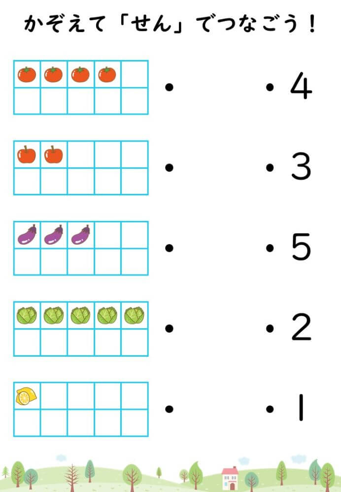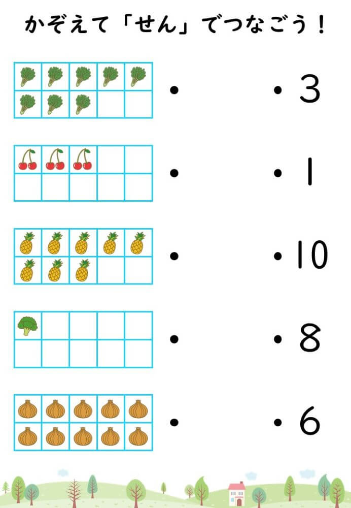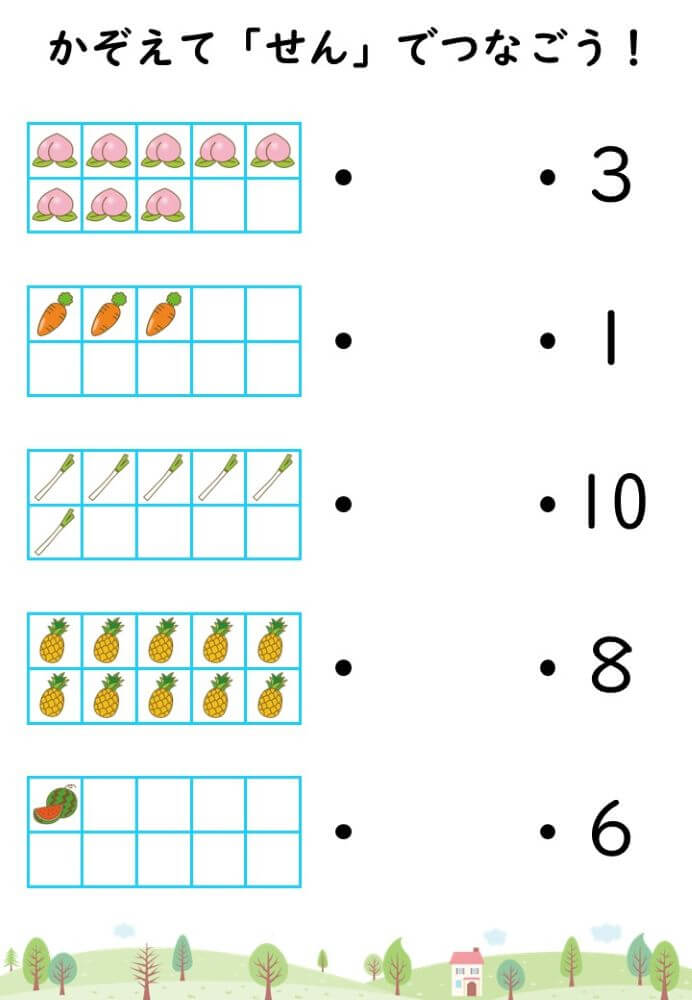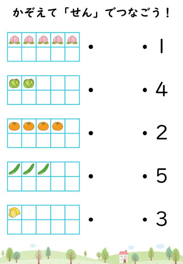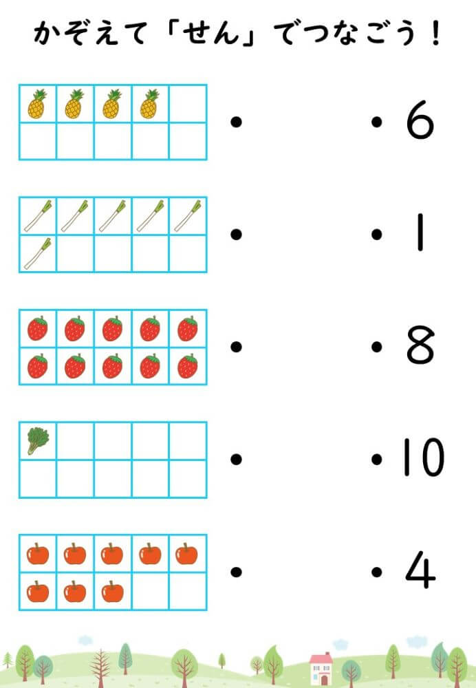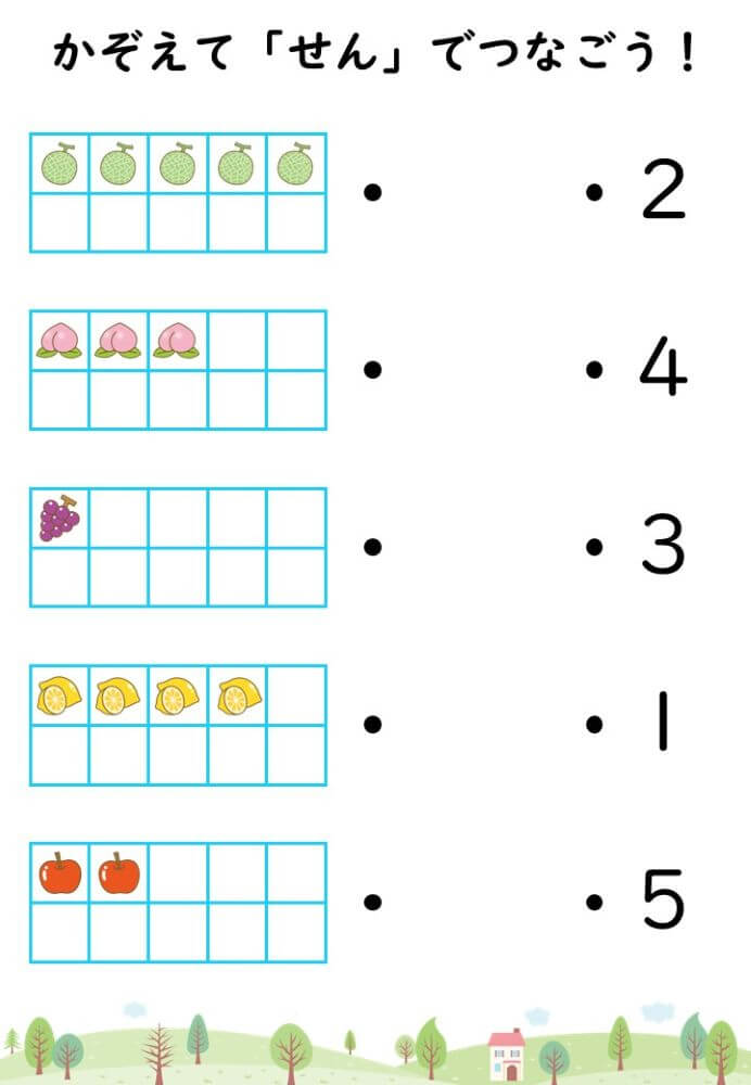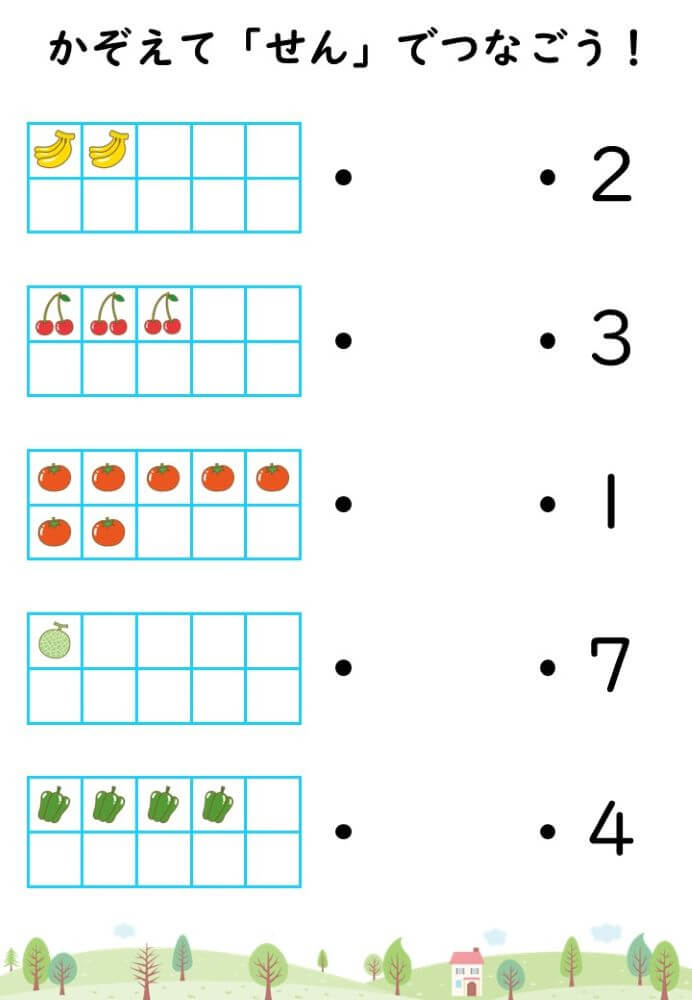 このプリントでは、果物などのイラストを数え、対応する数字へ線を引くことで数と数字の関係を練習できます。