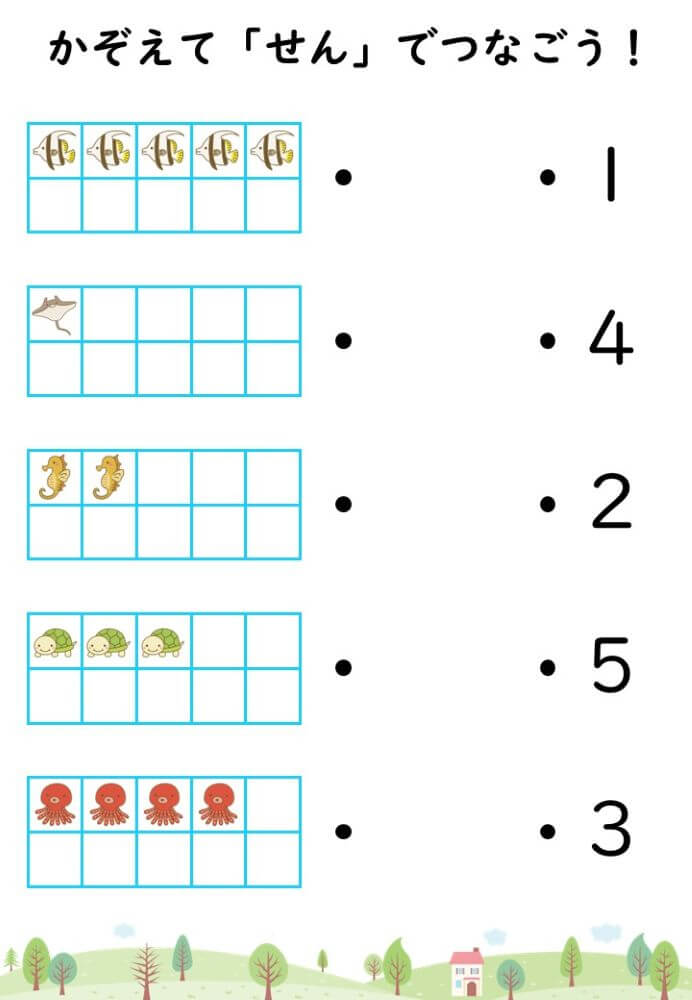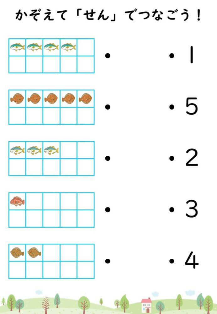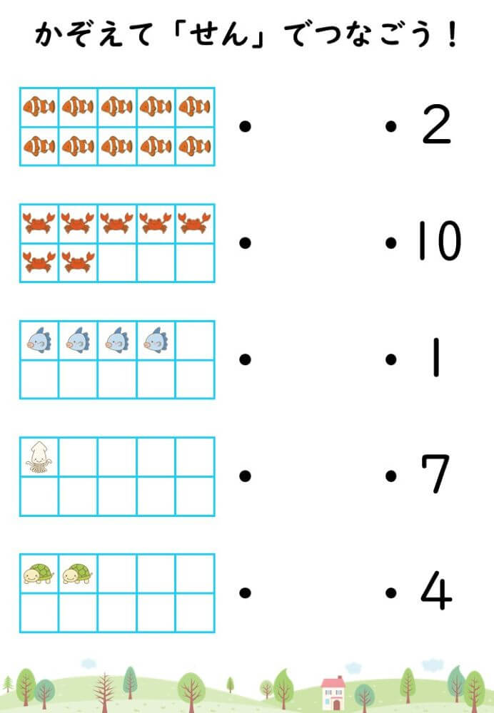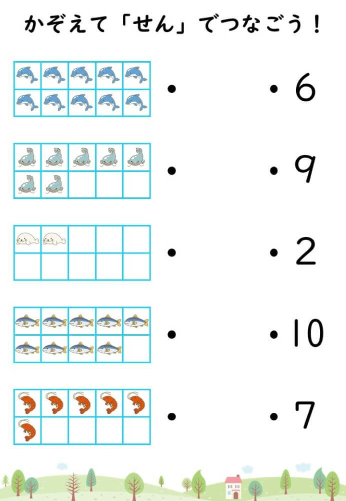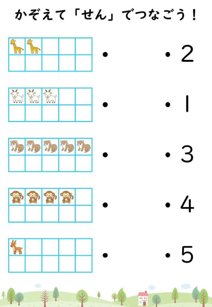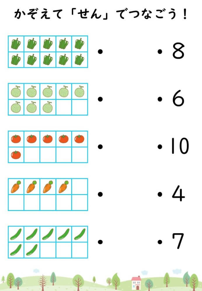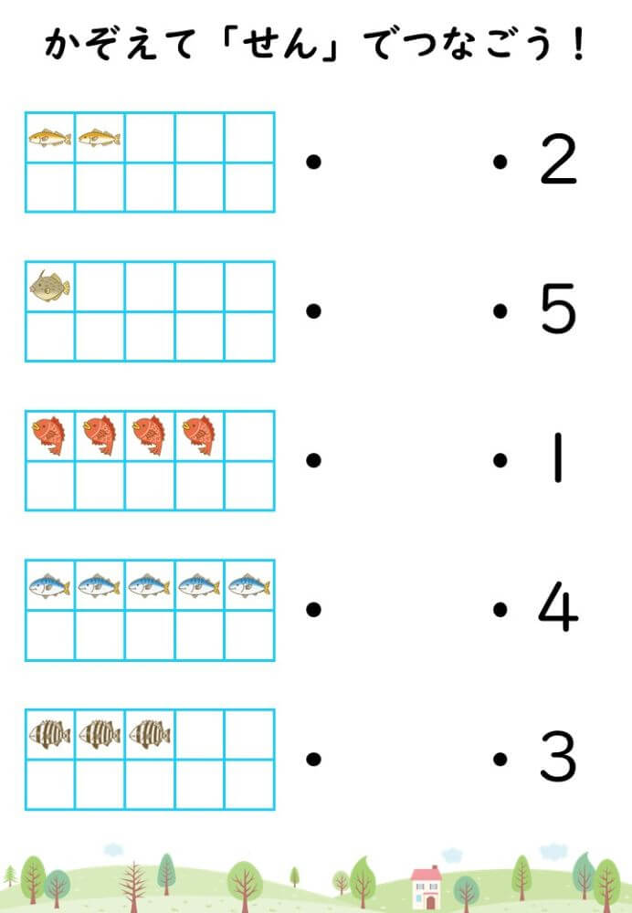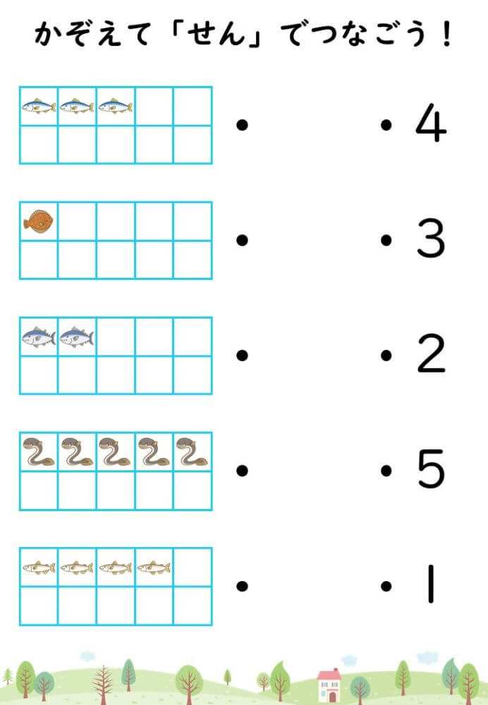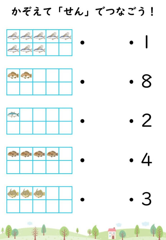 このプリントでは、果物などのイラストを数え、対応する数字へ線を引くことで数と数字の関係を練習できます。