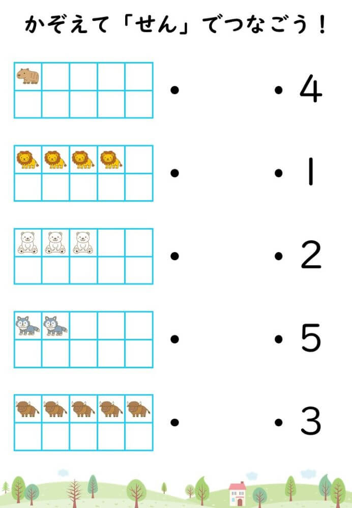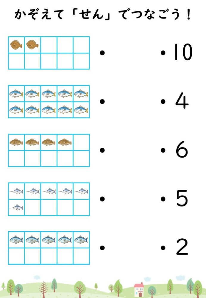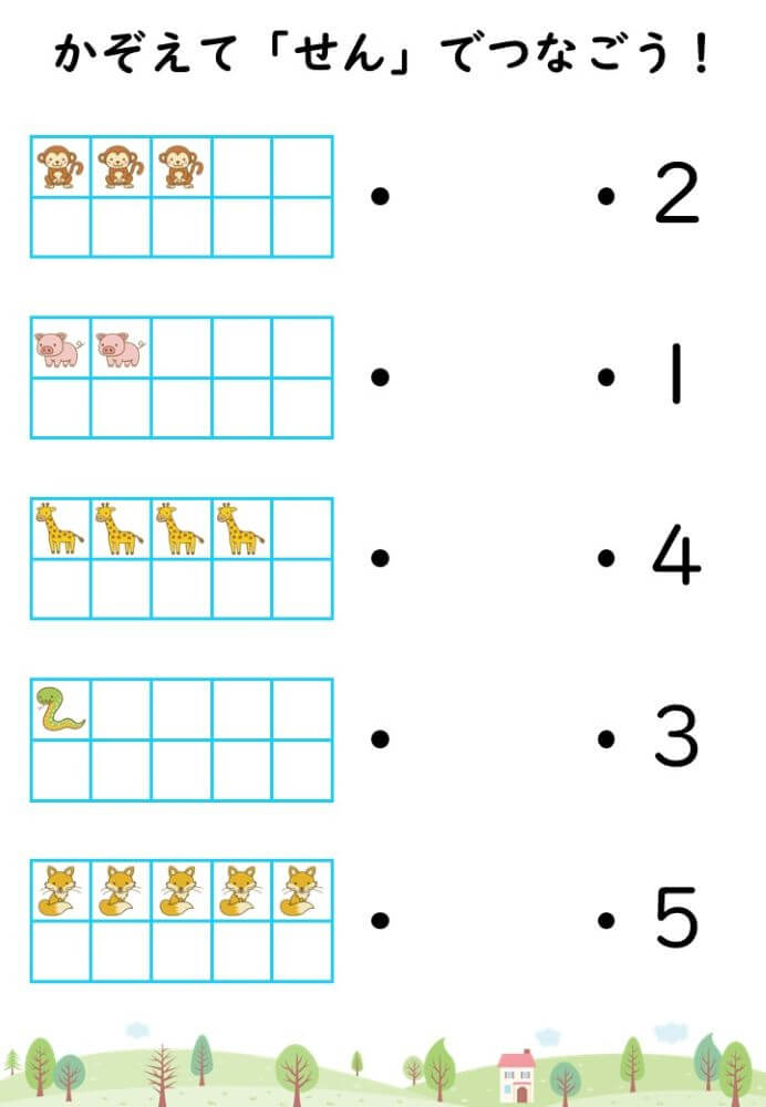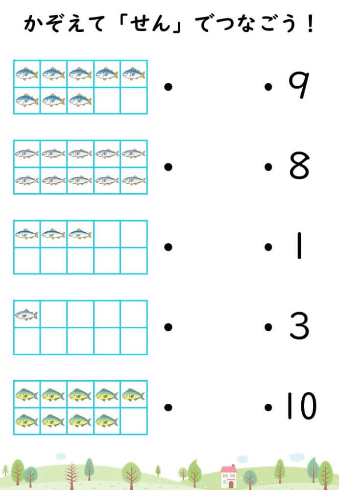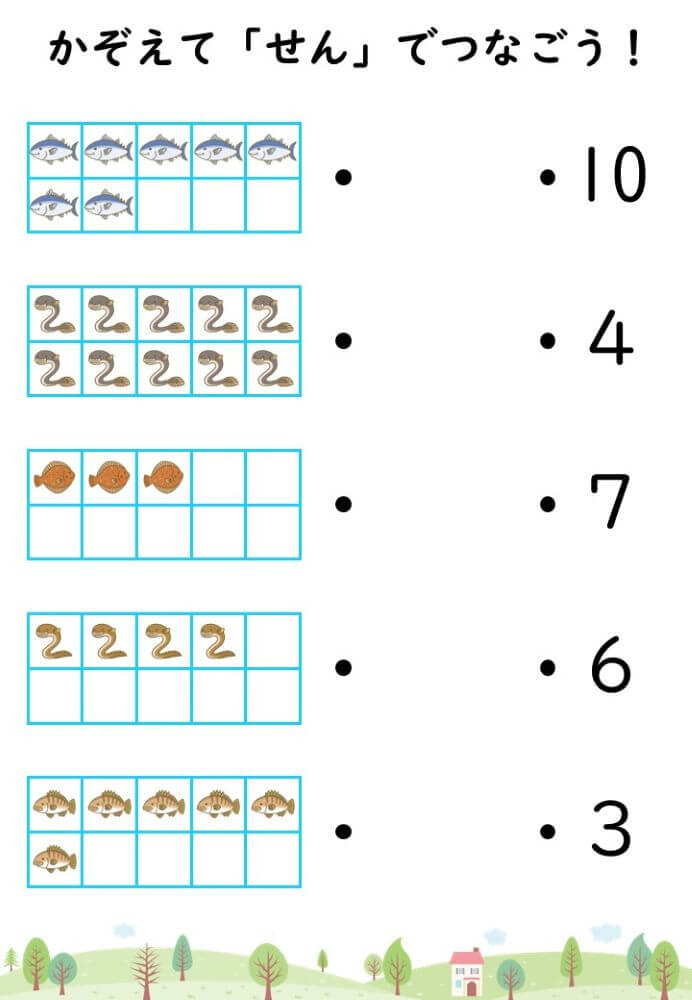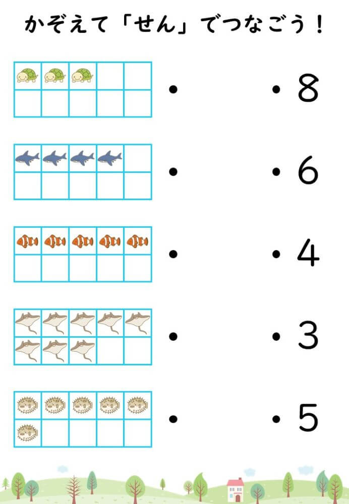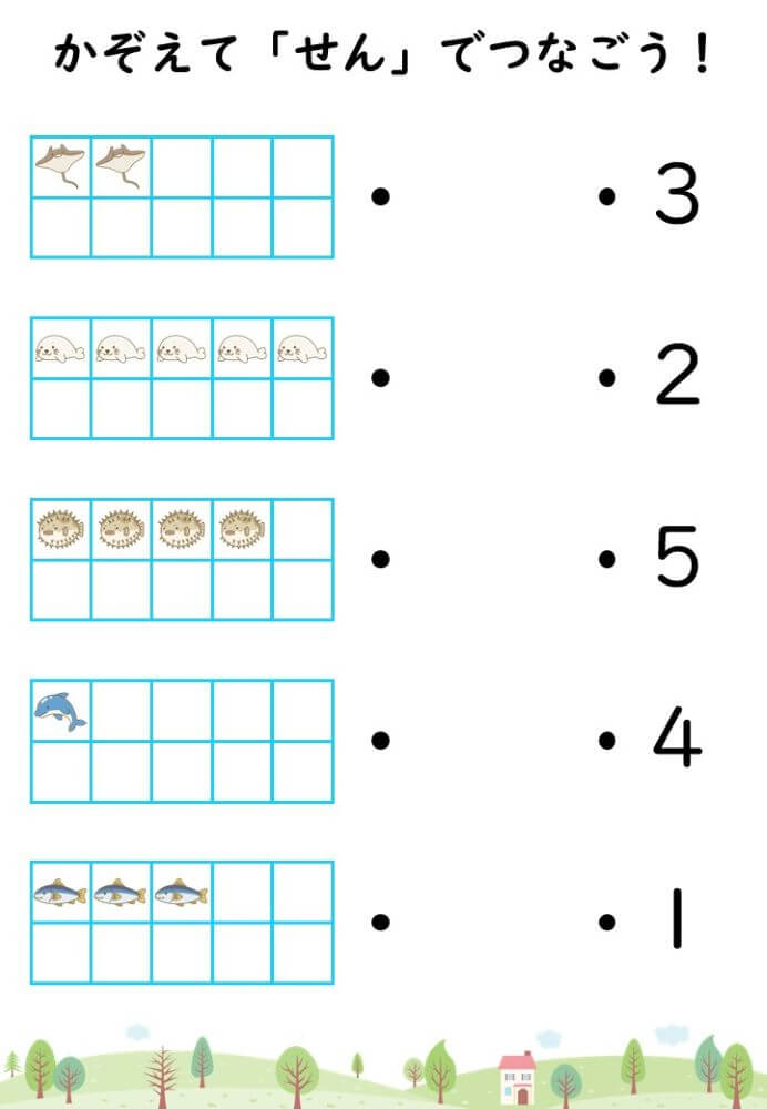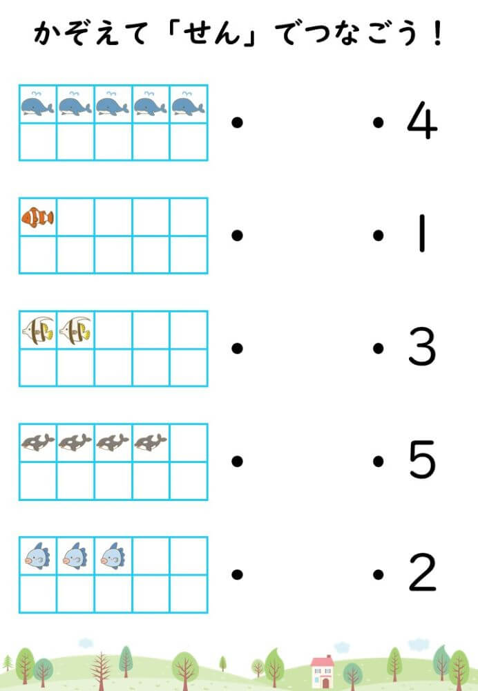 このプリントでは、果物などのイラストを数え、対応する数字へ線を引くことで数と数字の関係を練習できます。