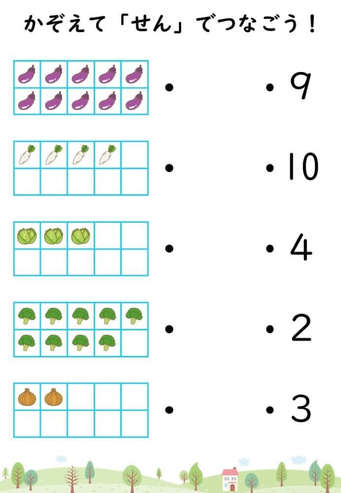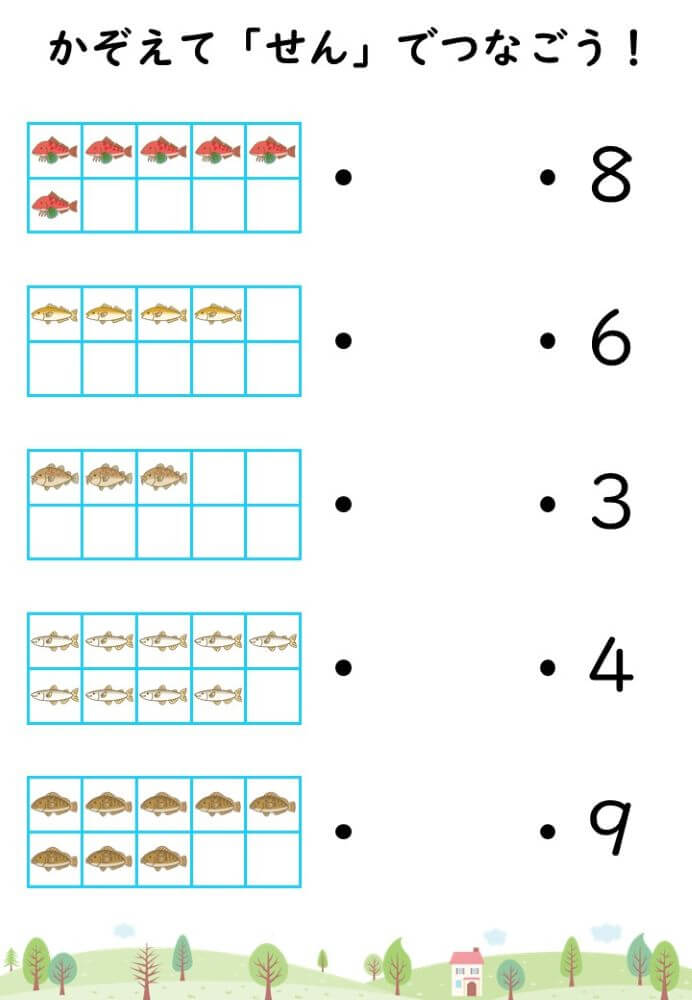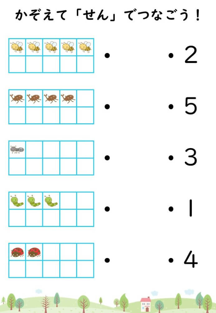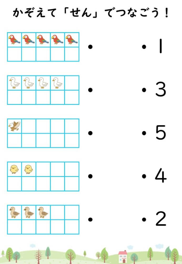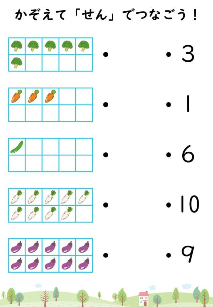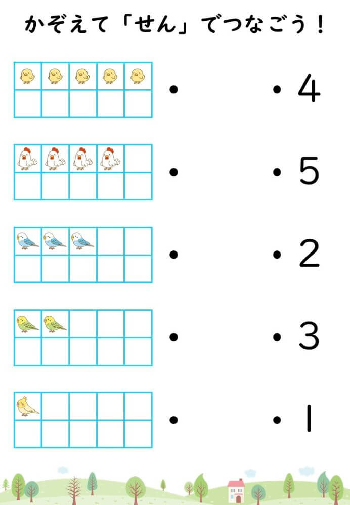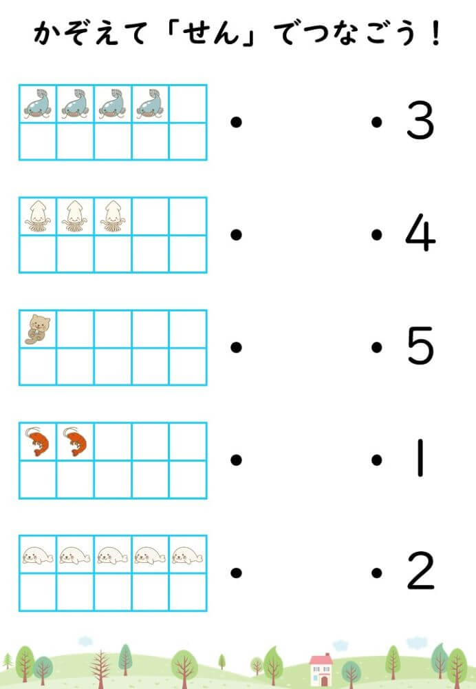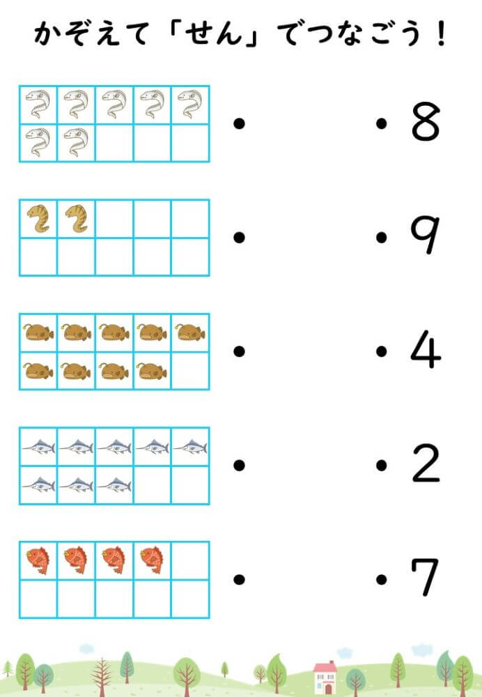 このプリントでは、果物などのイラストを数え、対応する数字へ線を引くことで数と数字の関係を練習できます。