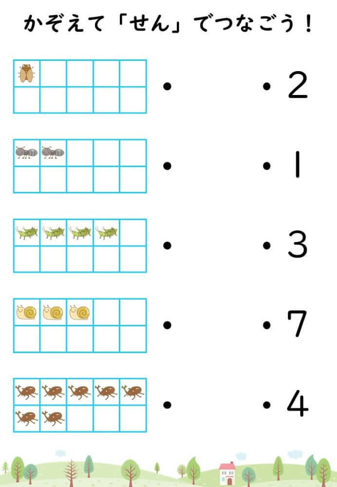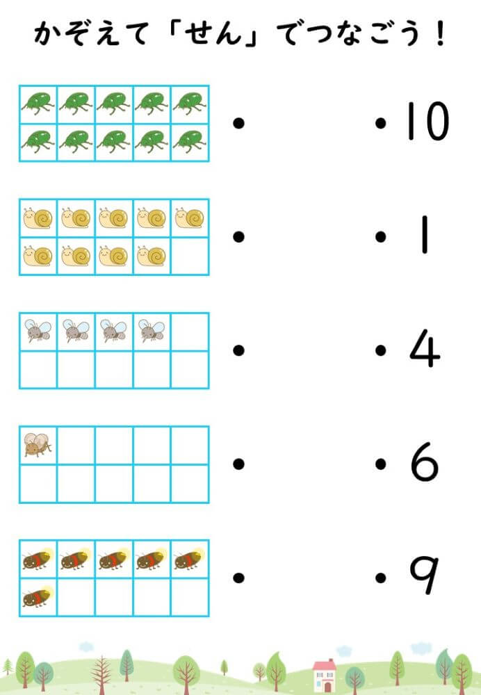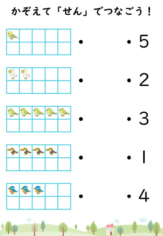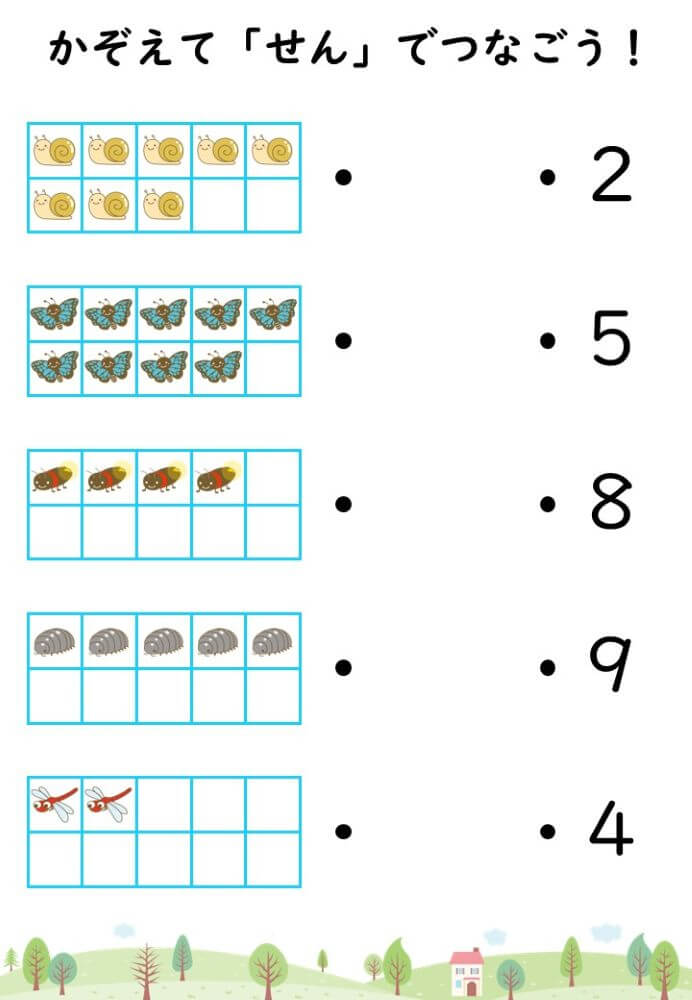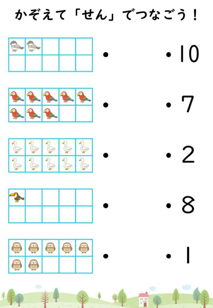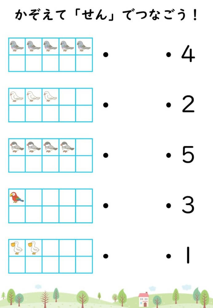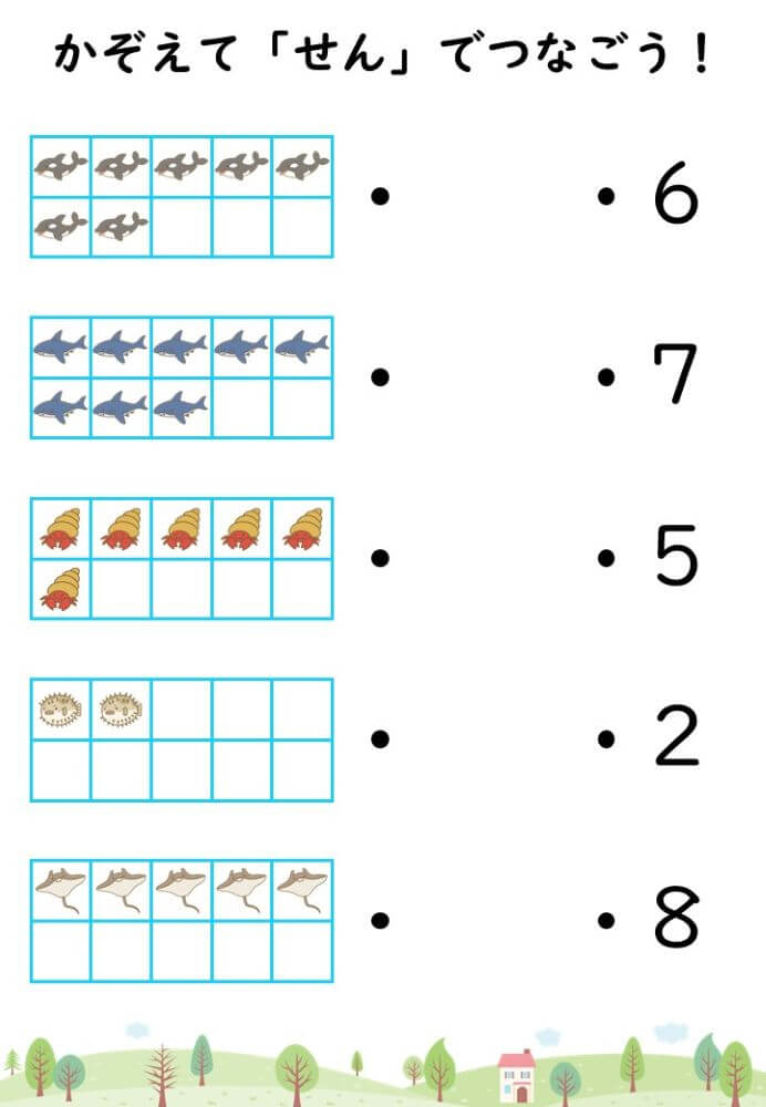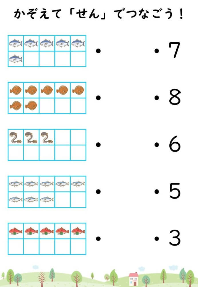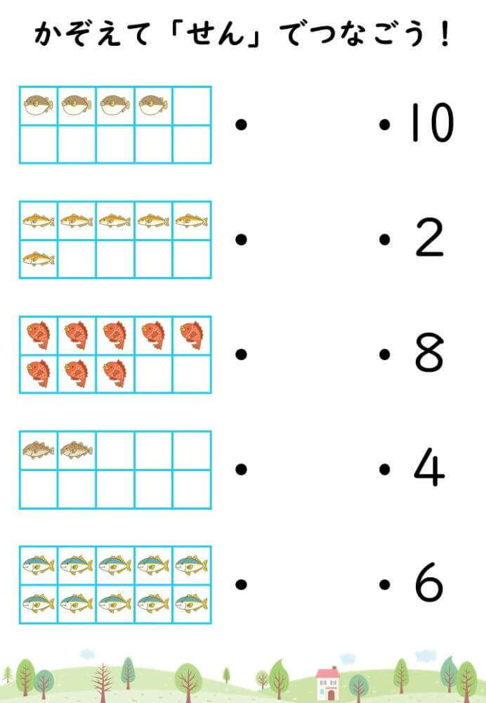 このプリントでは、果物などのイラストを数え、対応する数字へ線を引くことで数と数字の関係を練習できます。