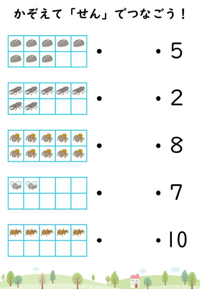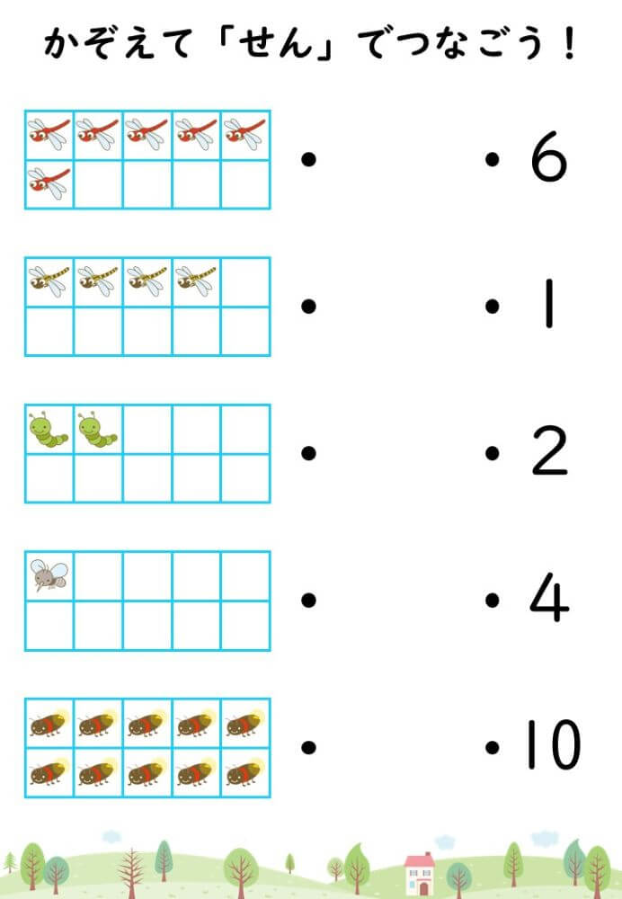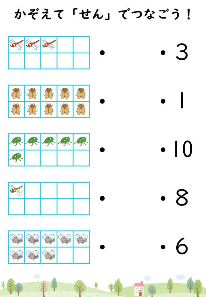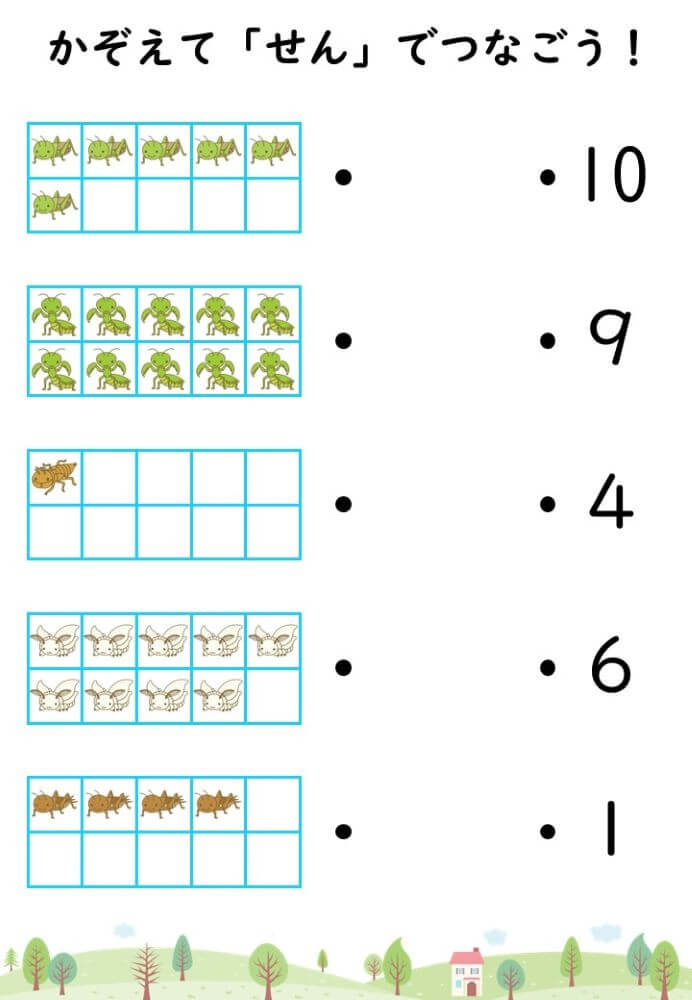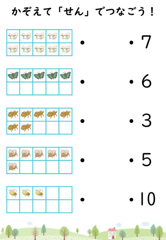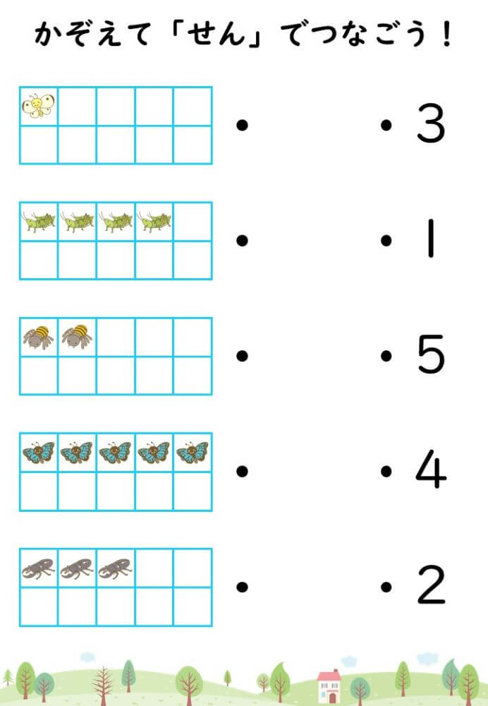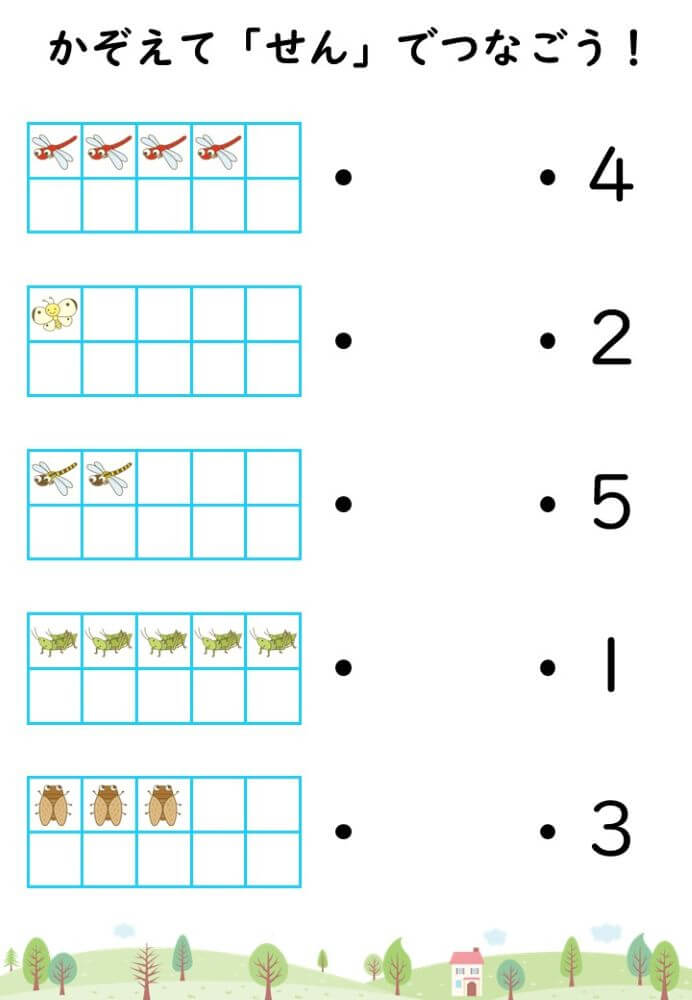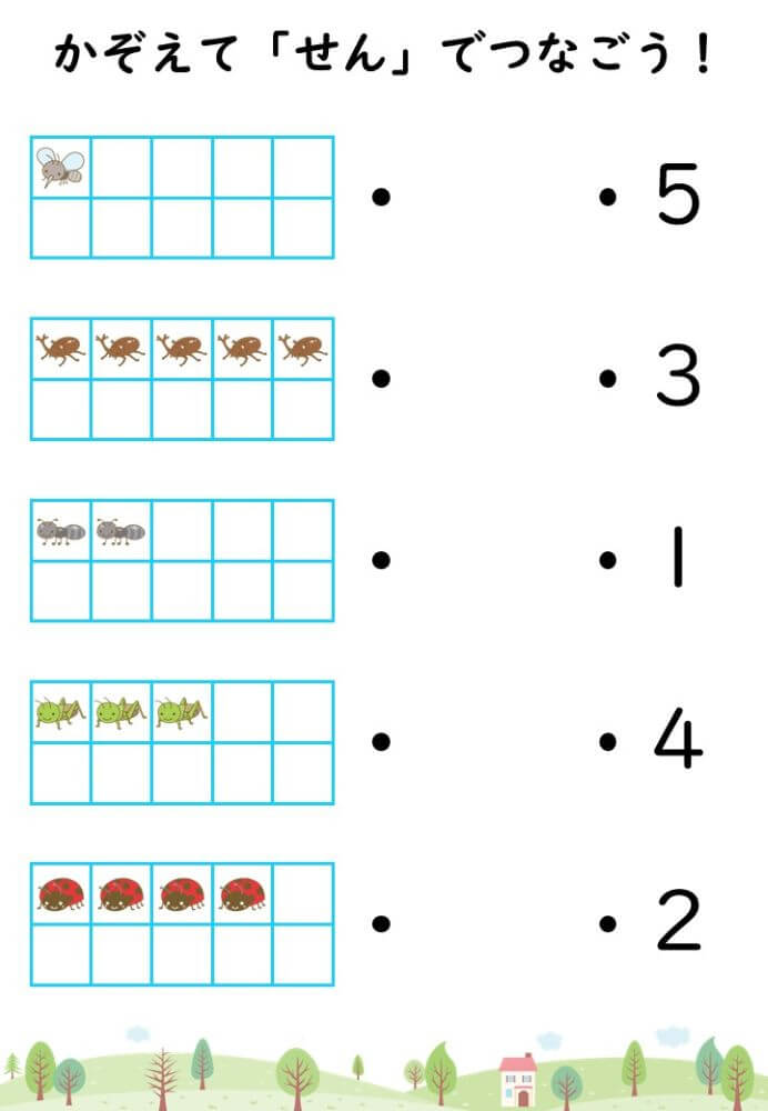 このプリントでは、果物などのイラストを数え、対応する数字へ線を引くことで数と数字の関係を練習できます。