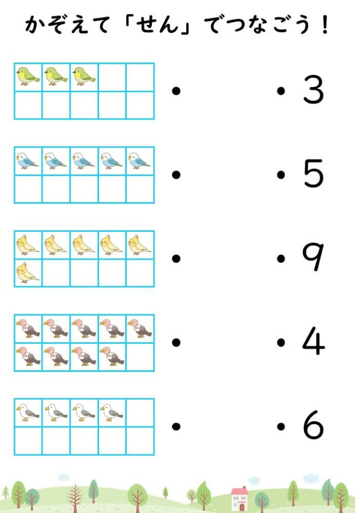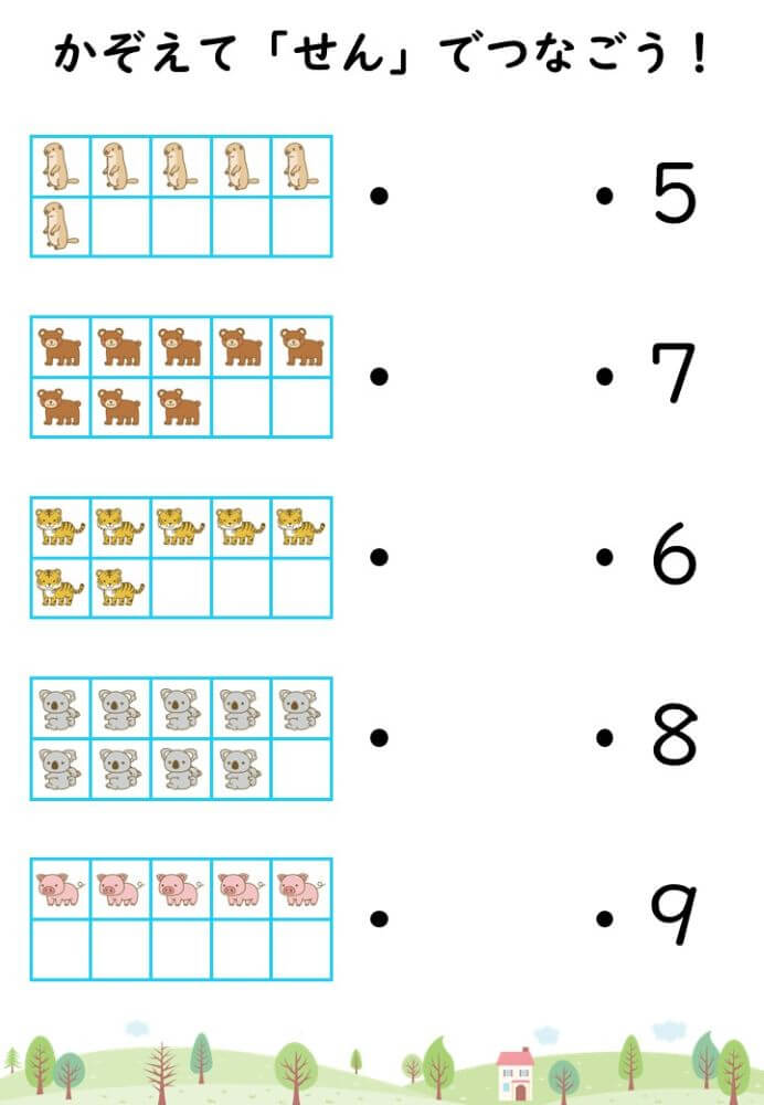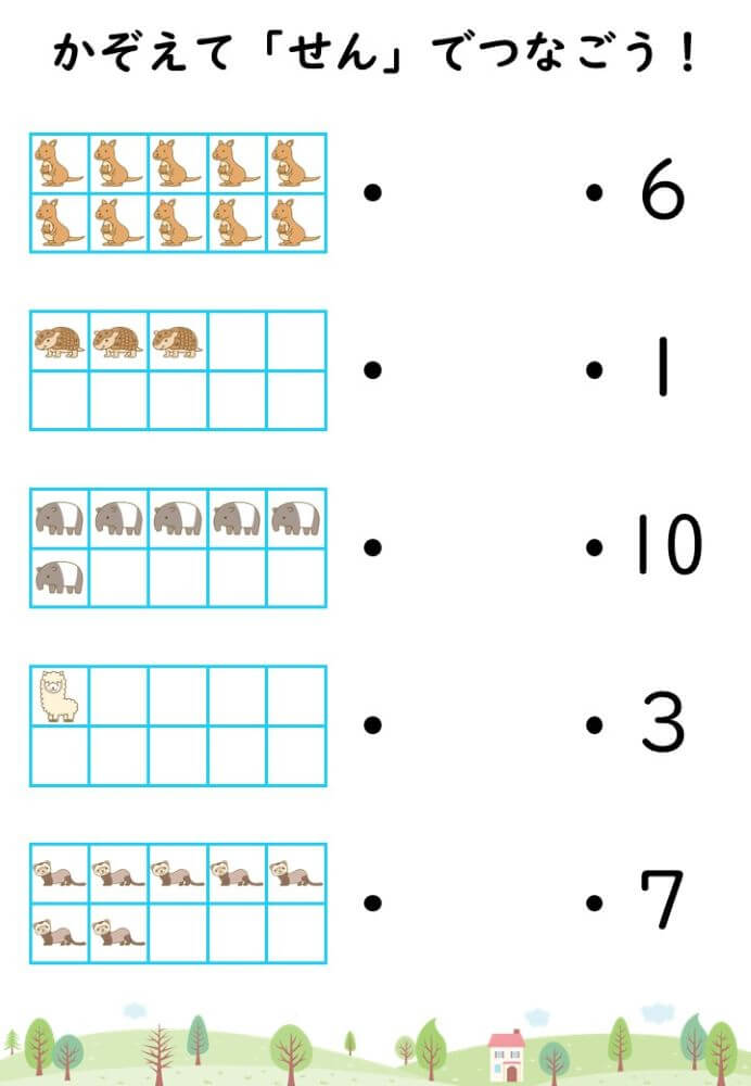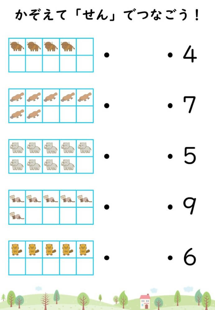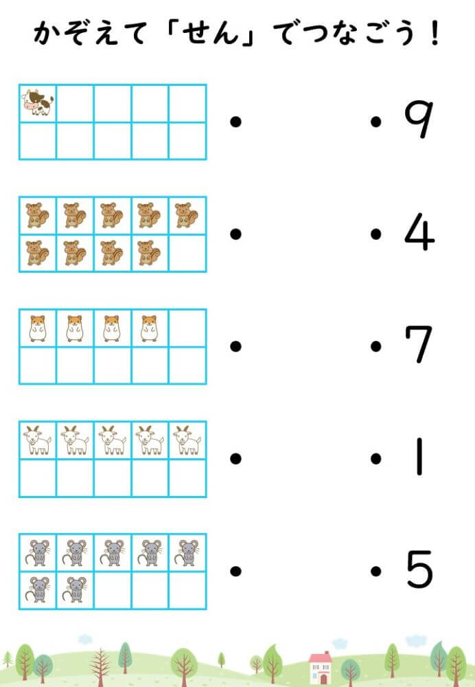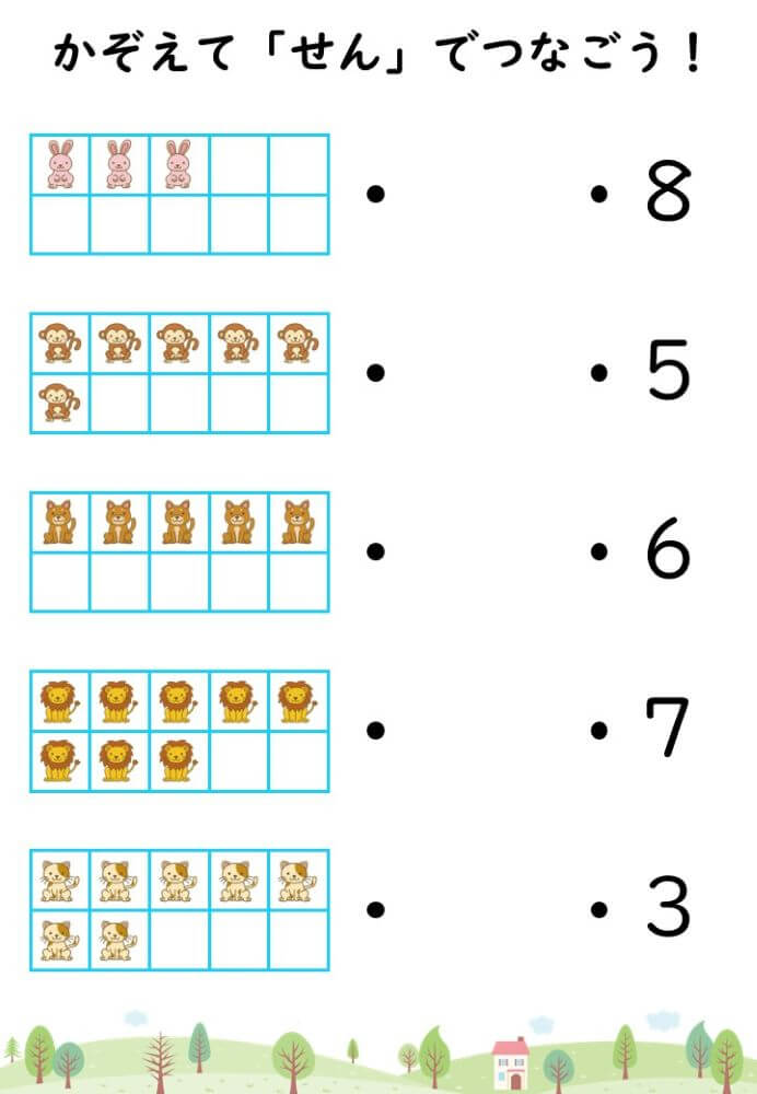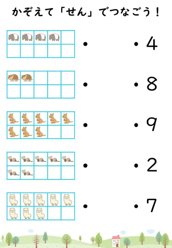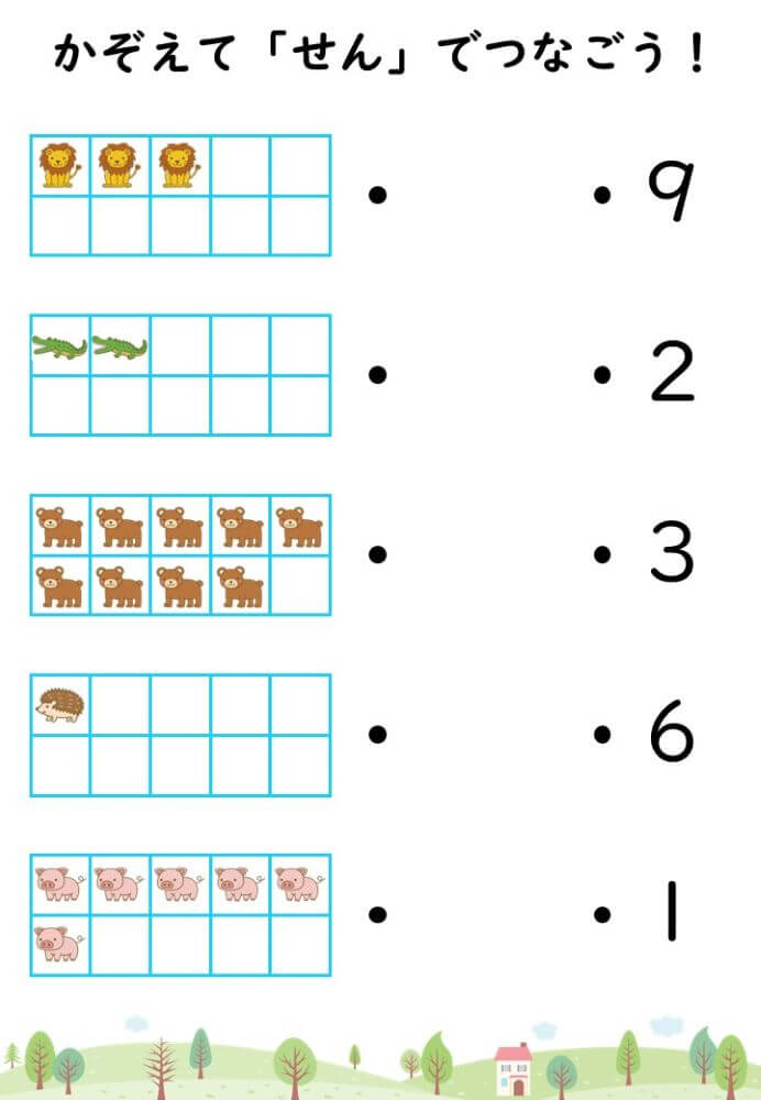 イラストを見て数え、対応する数字へ線を引くことで、「量」と「数字(記号)」の関係を自然に理解できる構成になっています。