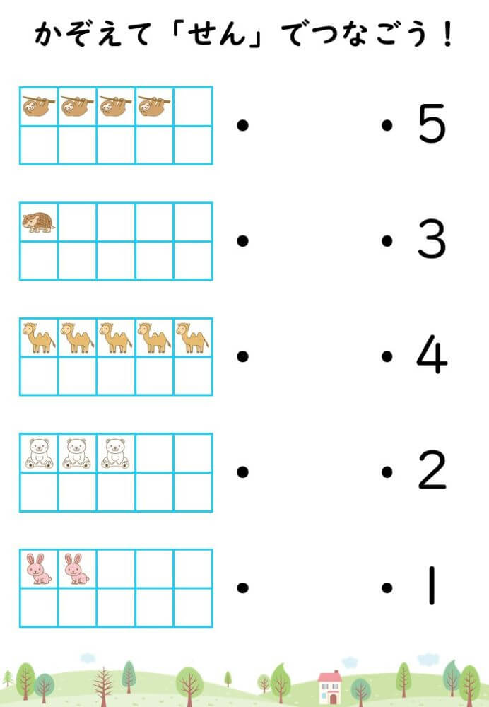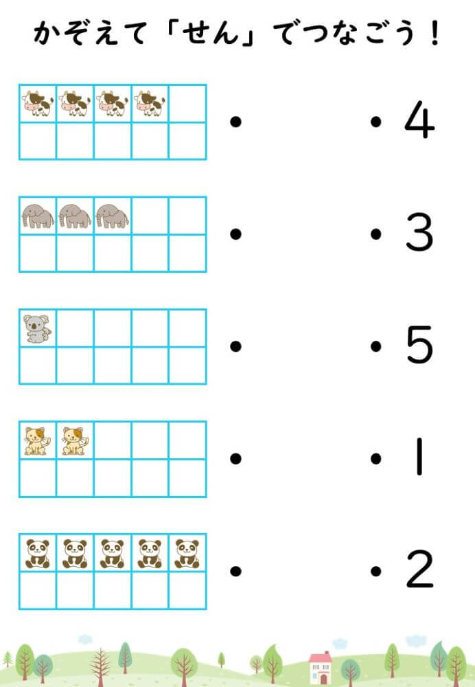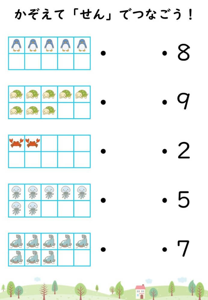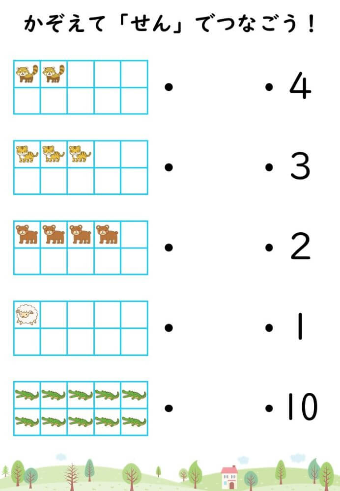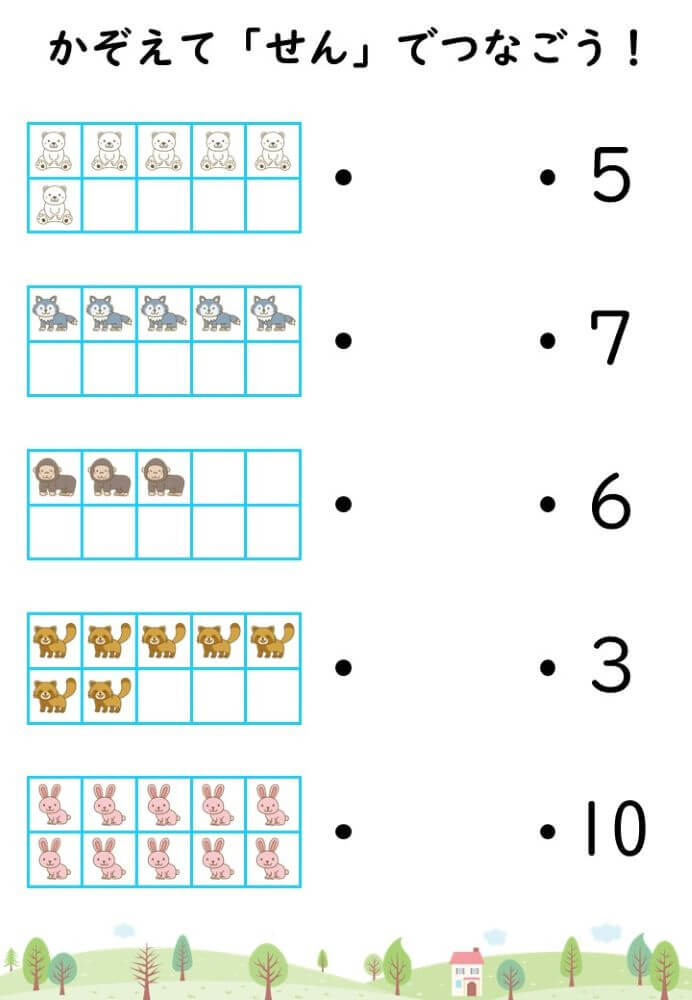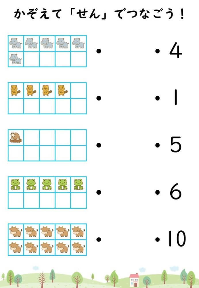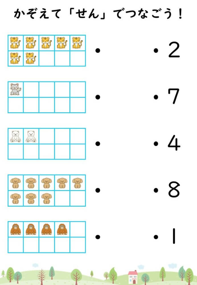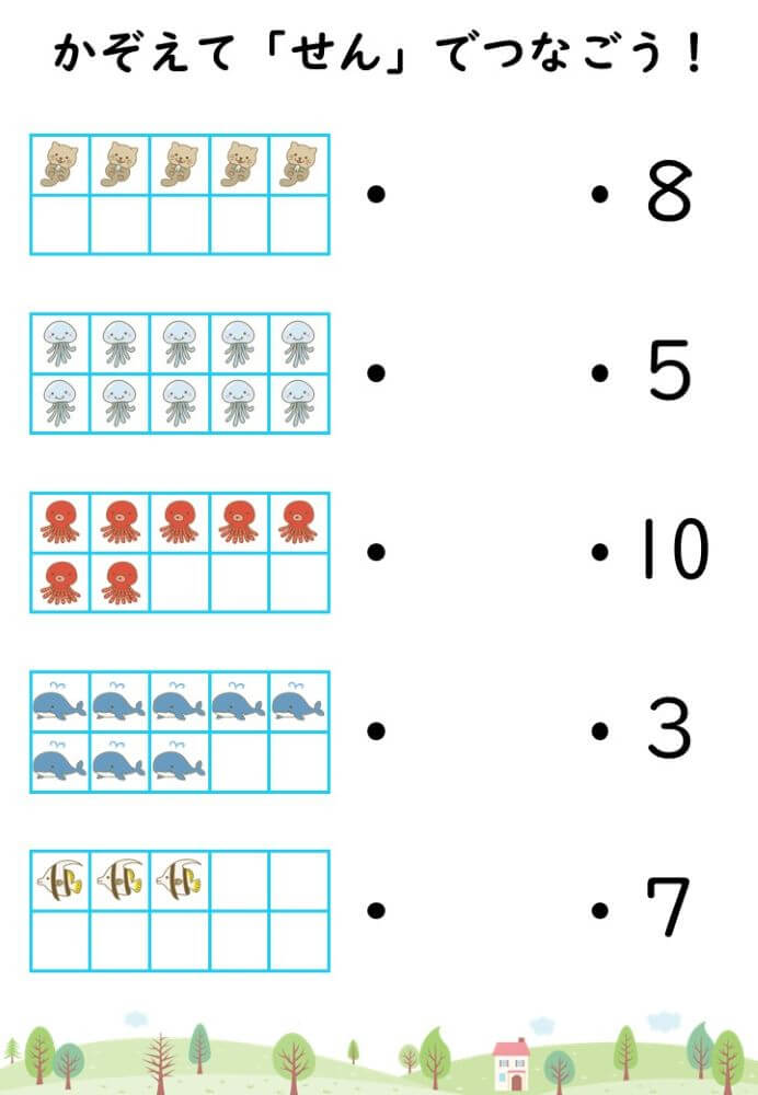 イラストを見て数え、対応する数字へ線を引くことで、「量」と「数字(記号)」の関係を自然に理解できる構成になっています。