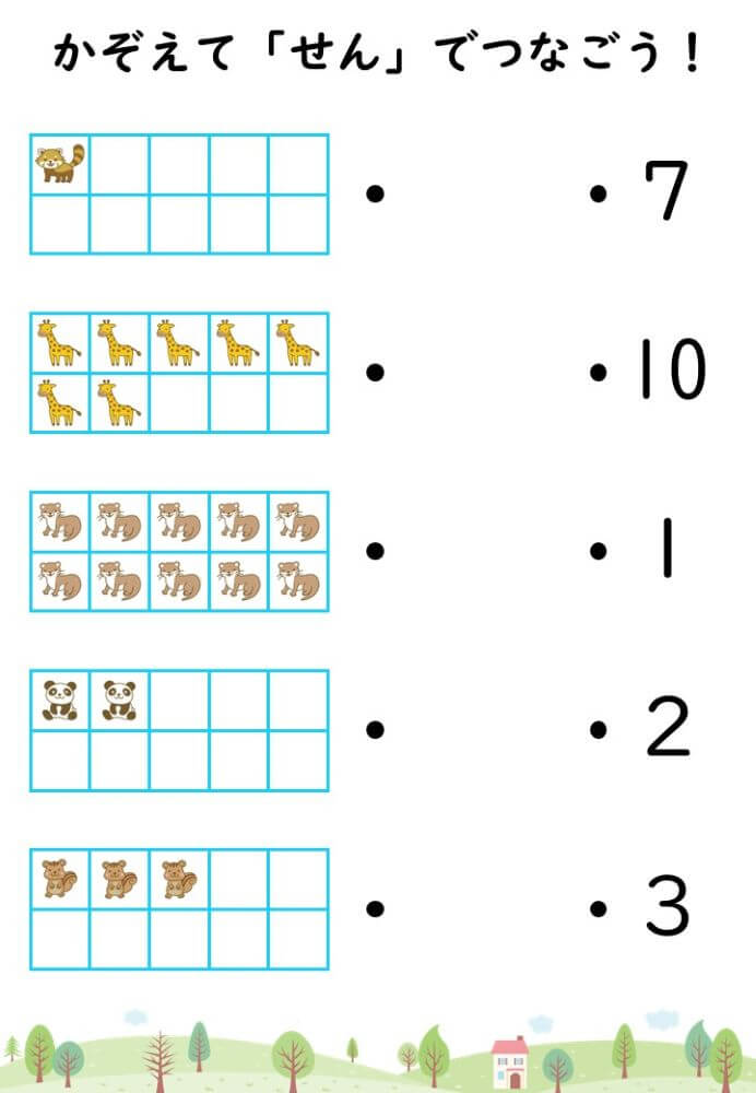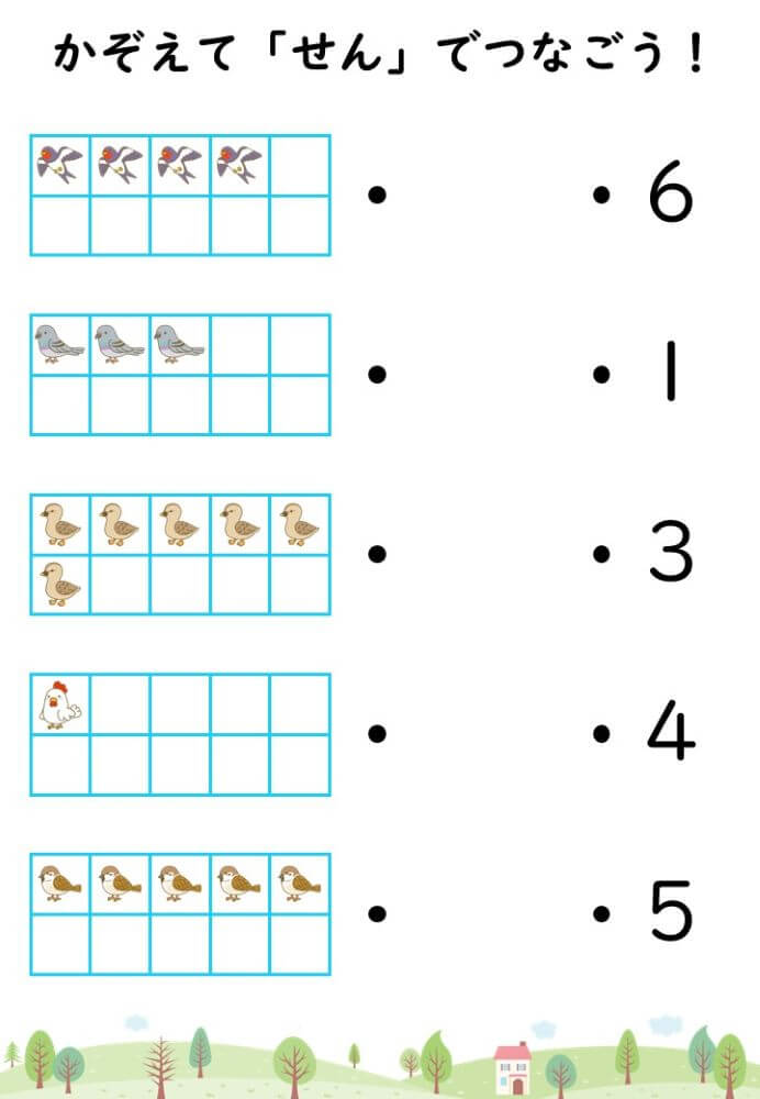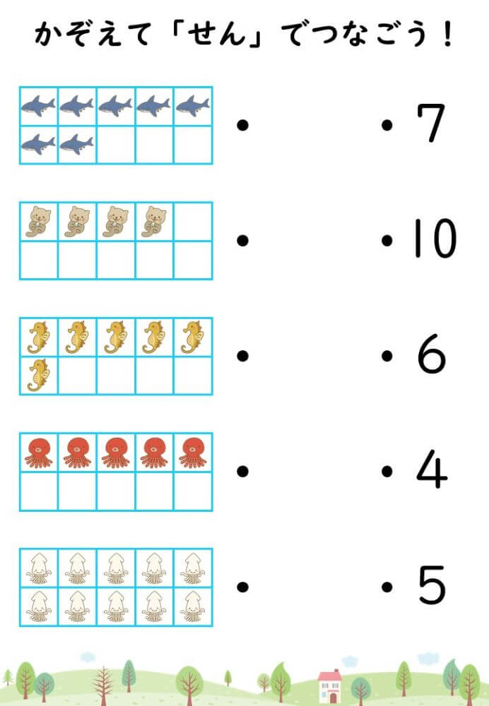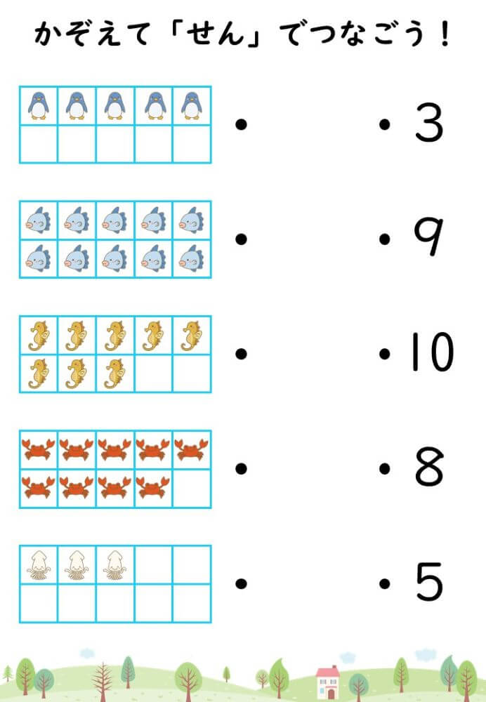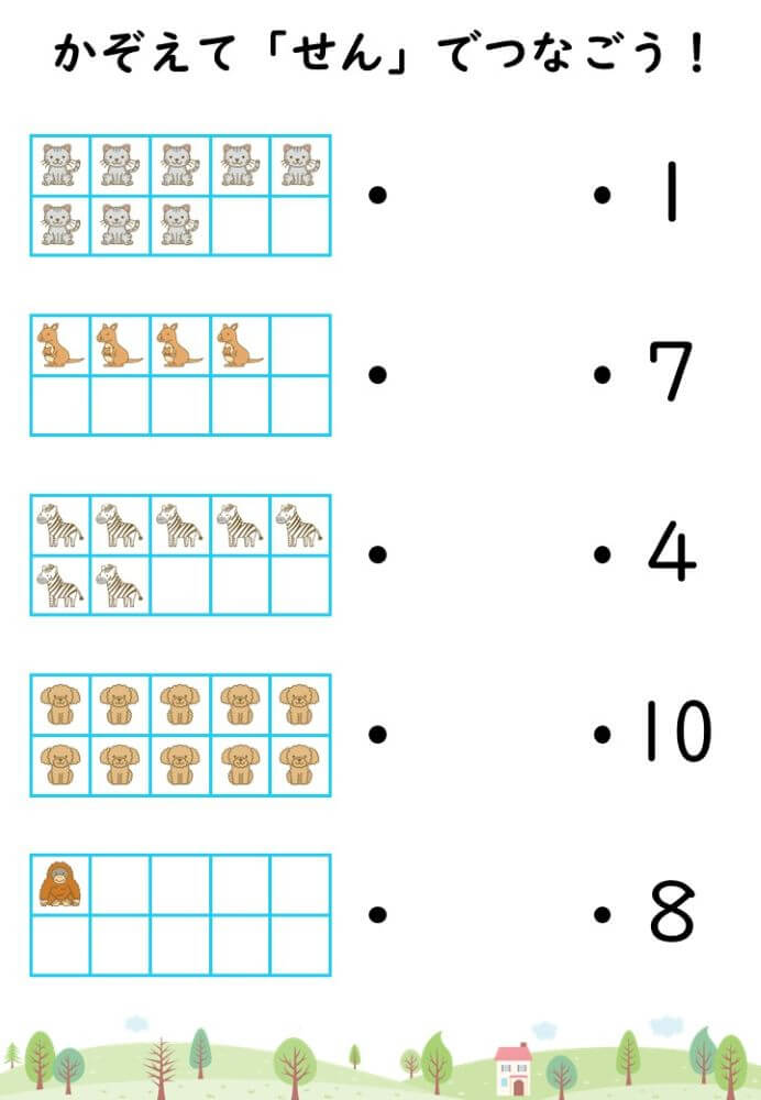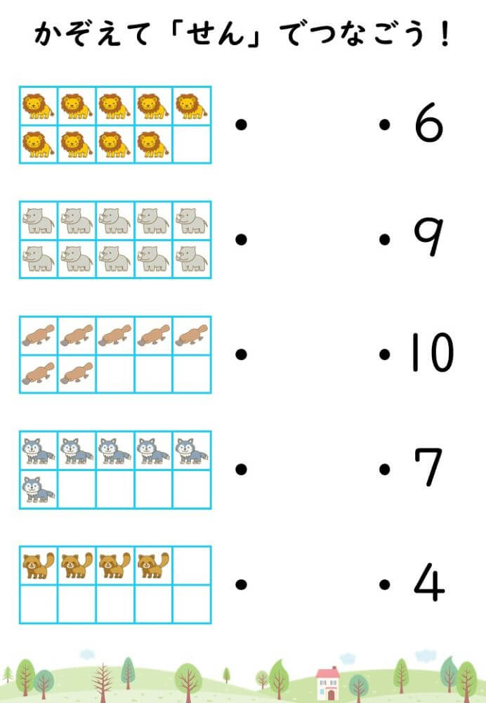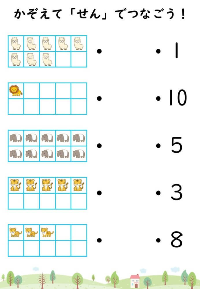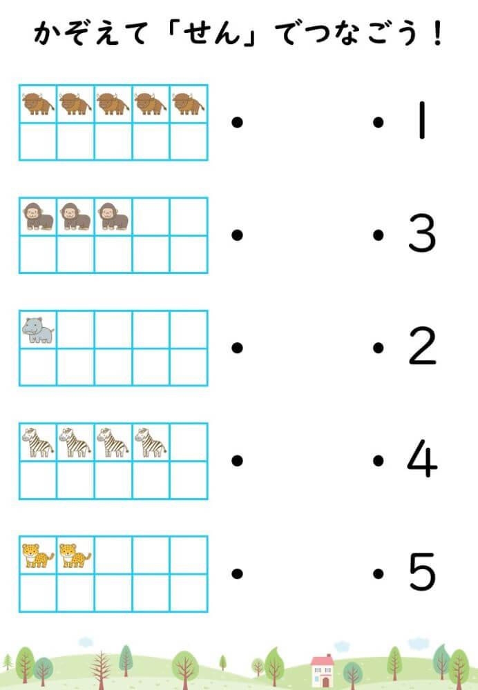 イラストを見て数え、対応する数字へ線を引くことで、「量」と「数字(記号)」の関係を自然に理解できる構成になっています。