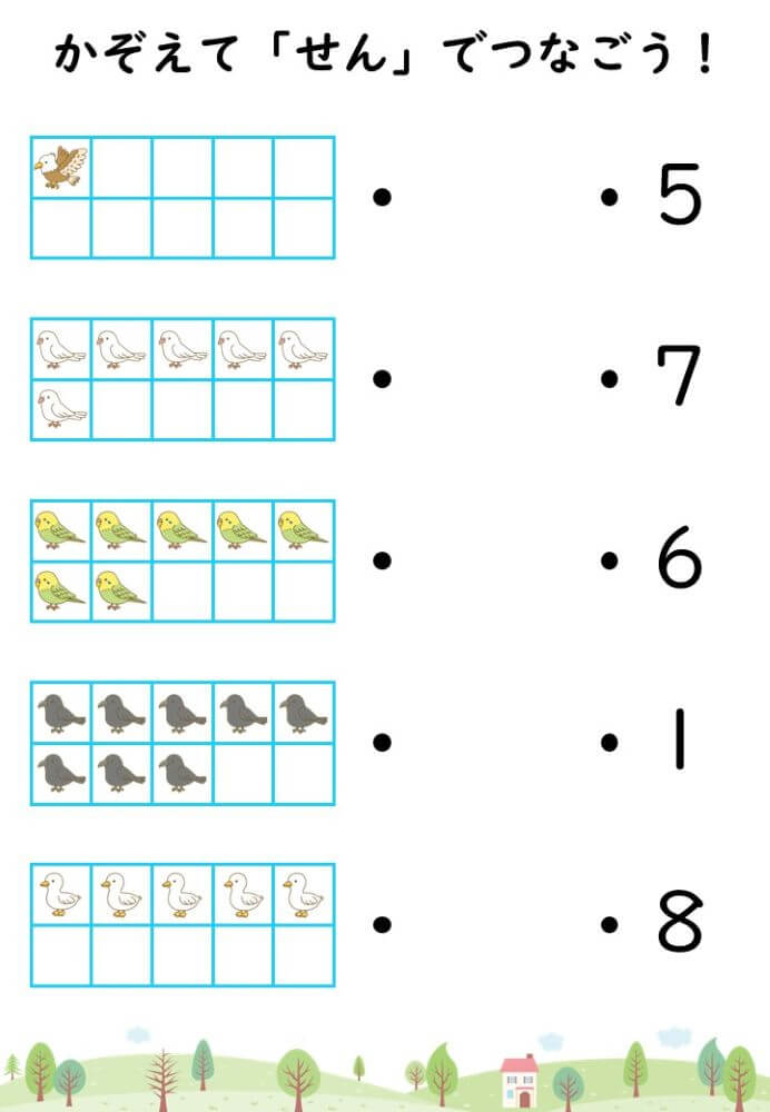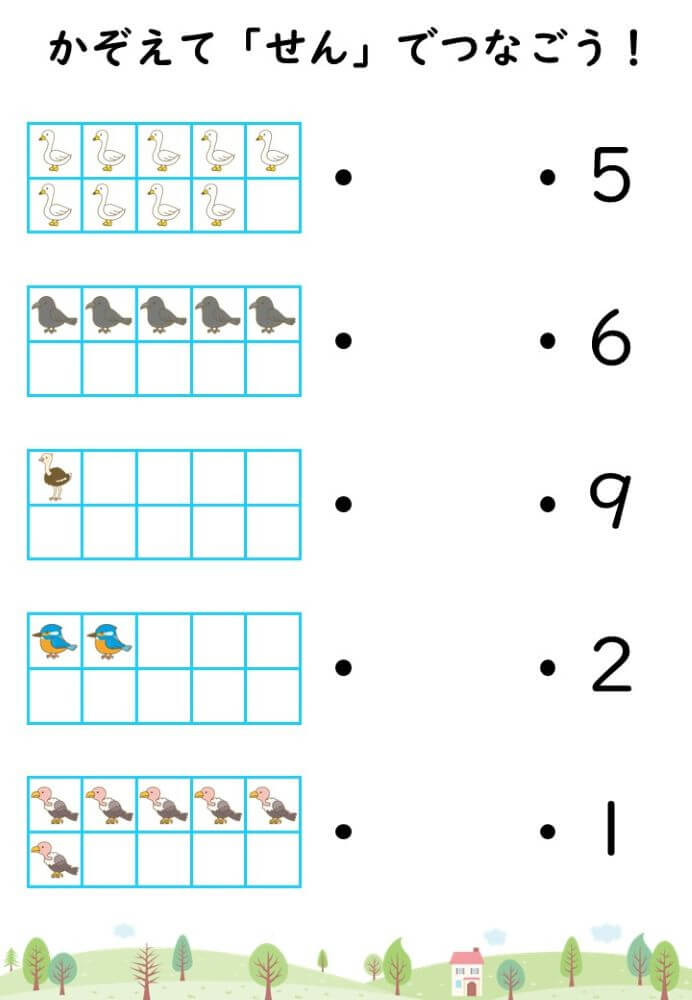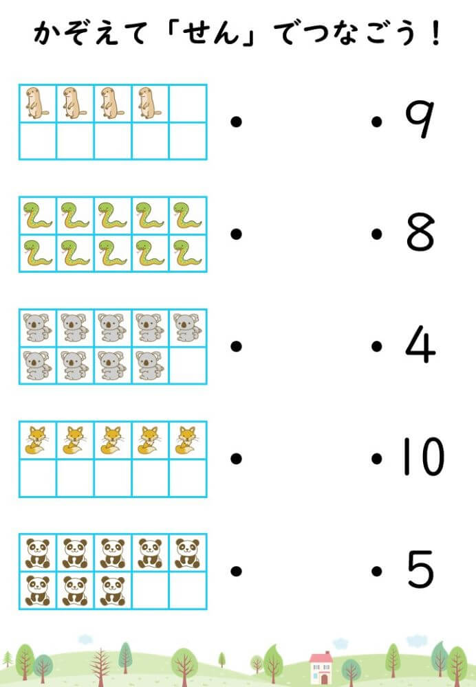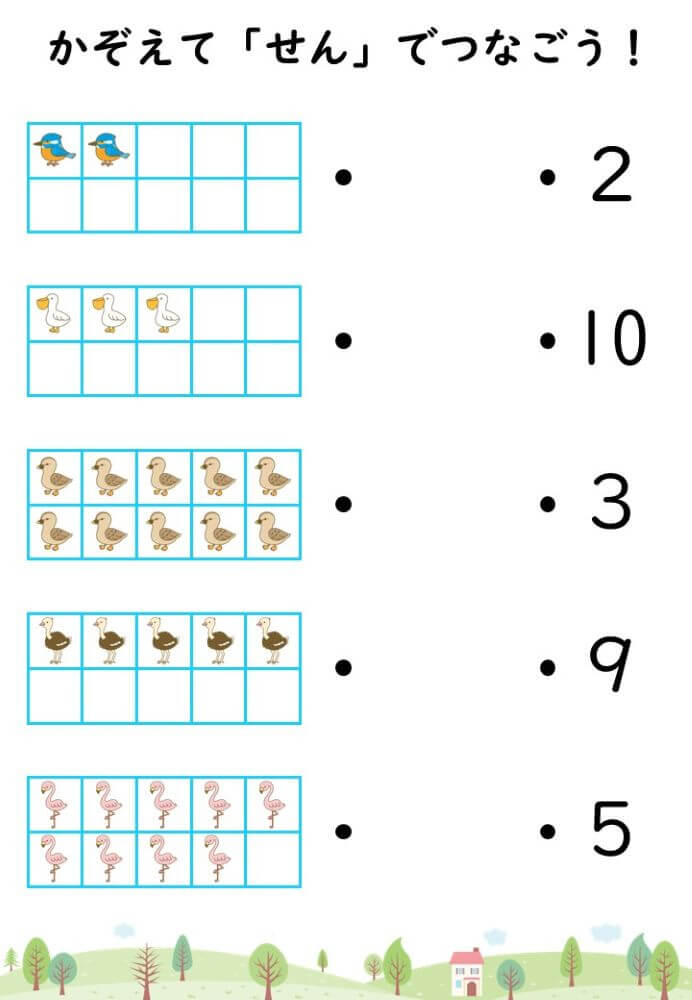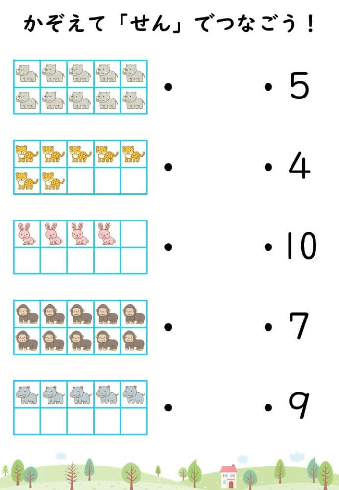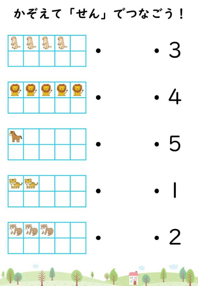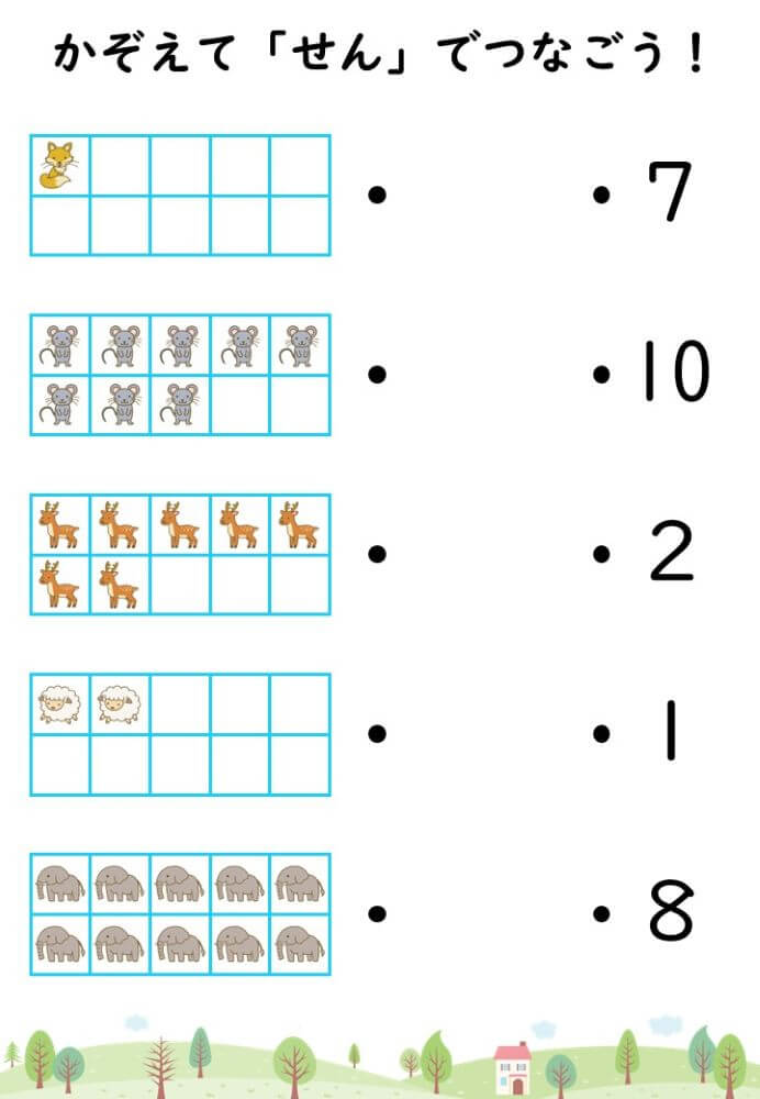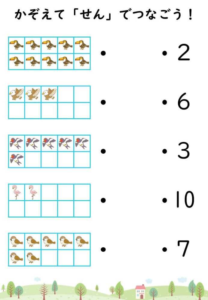 イラストを見て数え、対応する数字へ線を引くことで、「量」と「数字(記号)」の関係を自然に理解できる構成になっています。