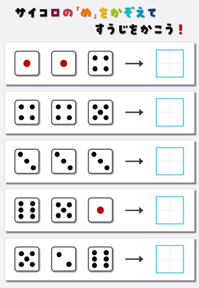 サイコロ3個の目を数えて数字を書くプリント