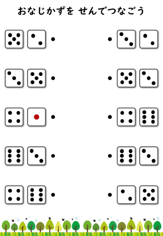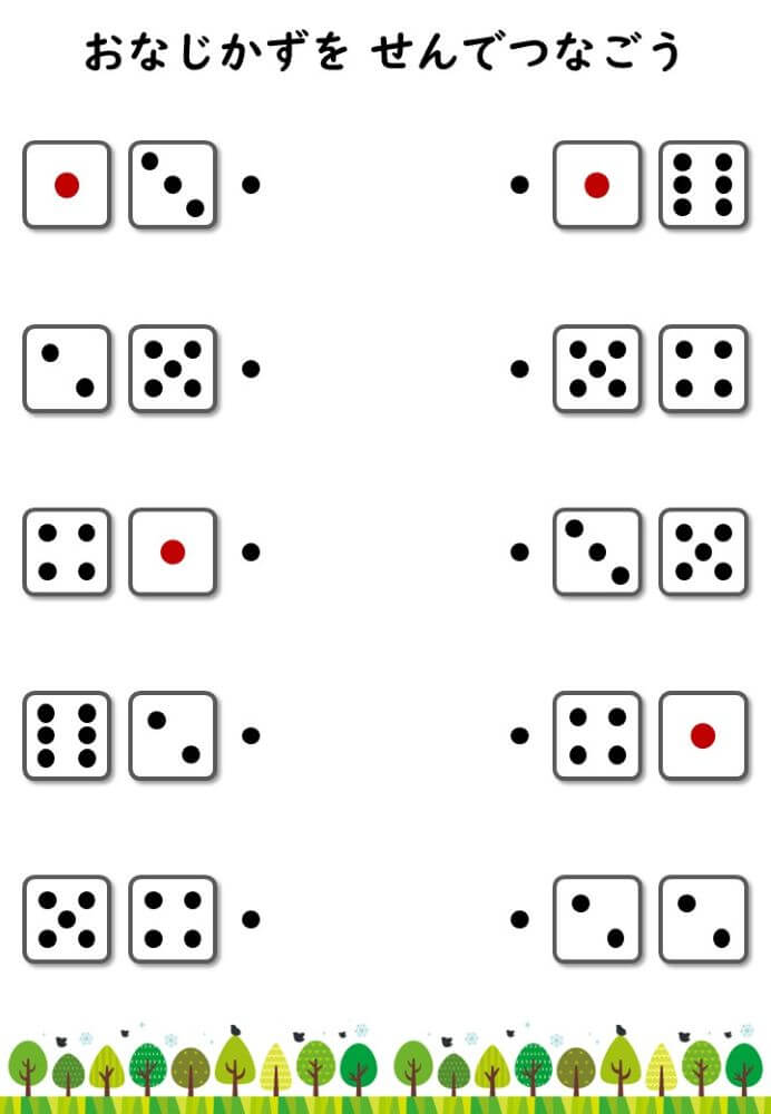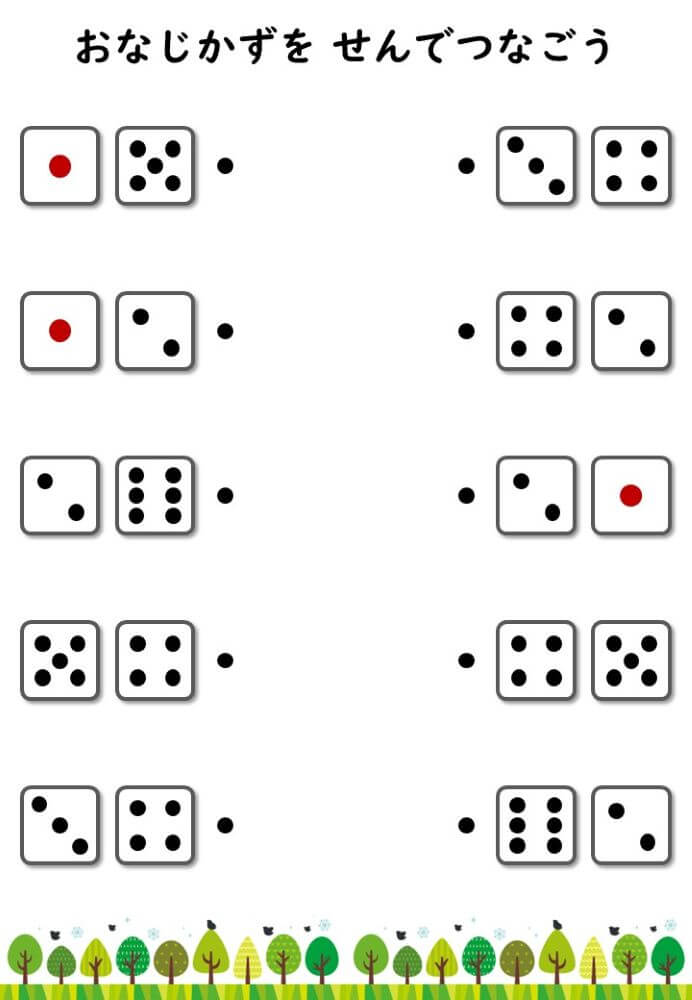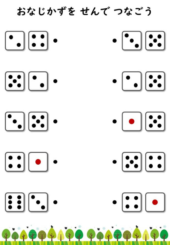 左右にあるサイコロの目をそれぞれ数え、合計が同じになるもの同士を線で結ぶプリントです。